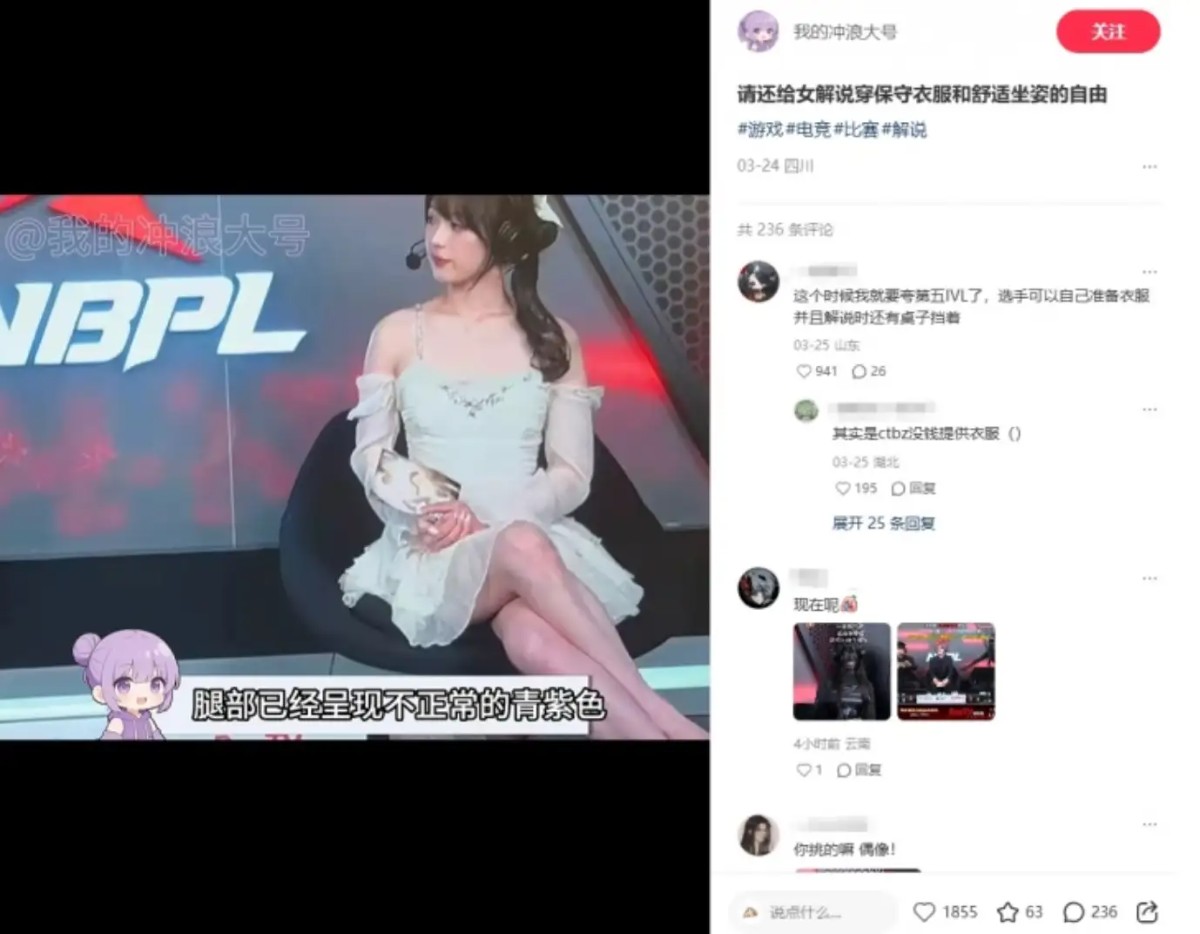 近期有网友在小红书发帖称永劫无间赛事女解说穿衣不自由,并且该赛事牺牲女解说的身体舒适性来吸引用户,维持电竞赛事热度。